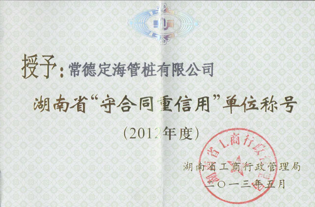 經(jīng)湖南省工商行政管理局在湖南日?qǐng)?bào)(2013年5月24日)第10版公示,公司及常德市77家單位獲得2012年度守合同重信用單位。
